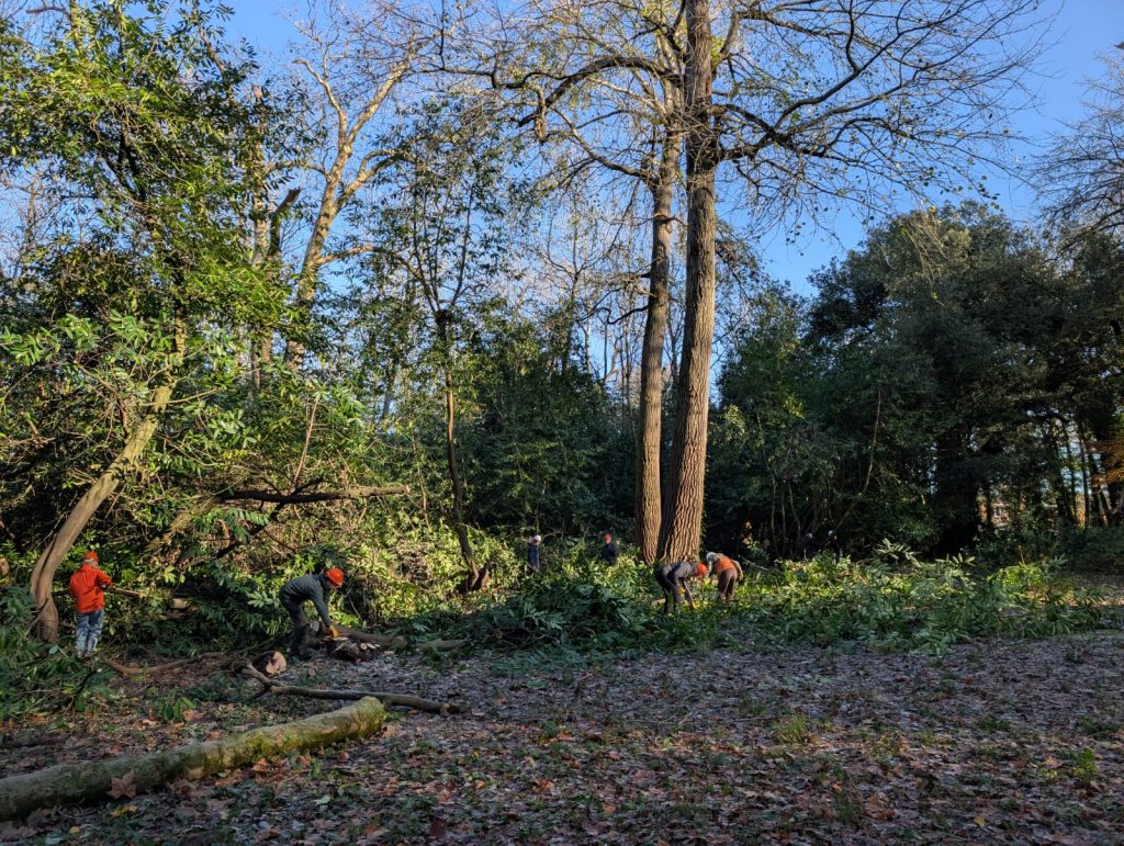 Each winter, Stoke Park Community Group work to cut back the cherry laurel in the woods in Stoke Park. In 2025/26 this work has focused on clearing and preserving the Great Saloon in Hermitage Wood.